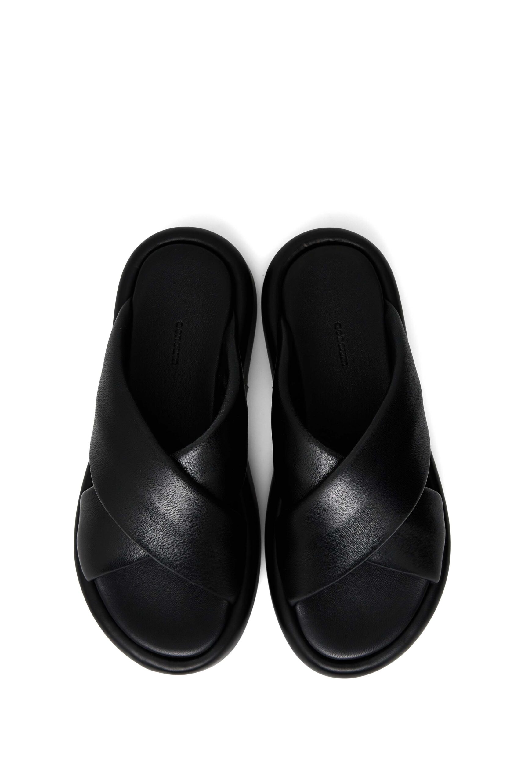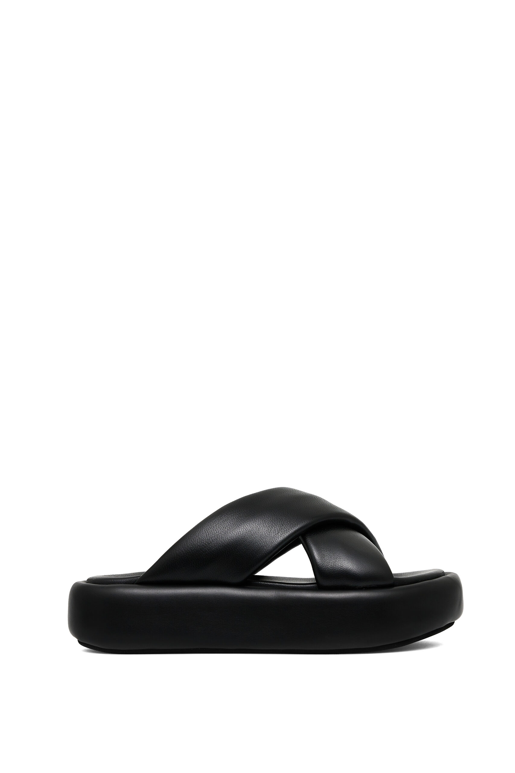 Flat leather sandals with padded slides and round toe. Embossed acnoum name on the insole. Dusty bag attached. Handmade in Italy.