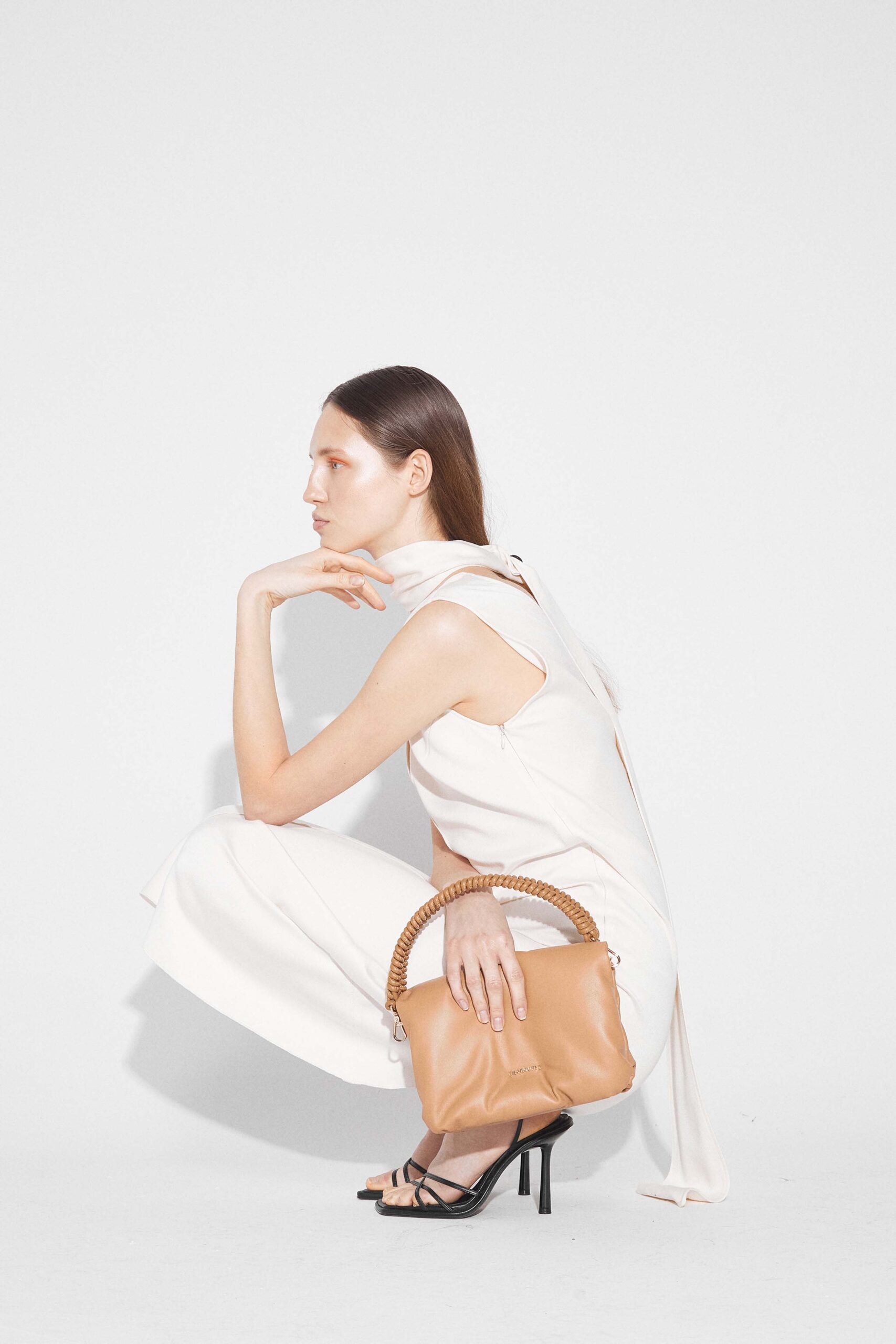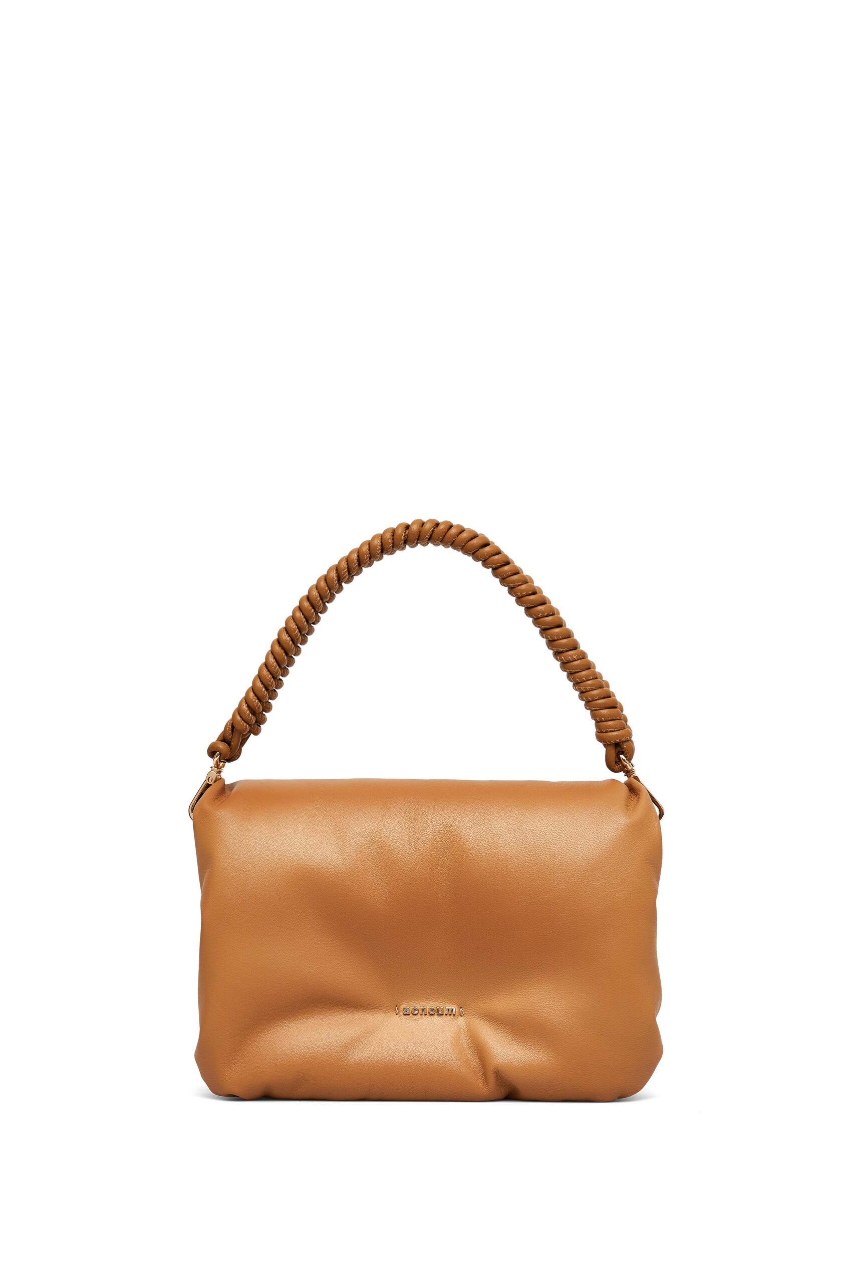 Medium handle and crossbody cuoio bag. Small zippered pocket and one compartment inside. Fastened with a magnetic closure. Gold fittings. Metal acnoum name outside. Dusty bag attached. Made in Poland.
