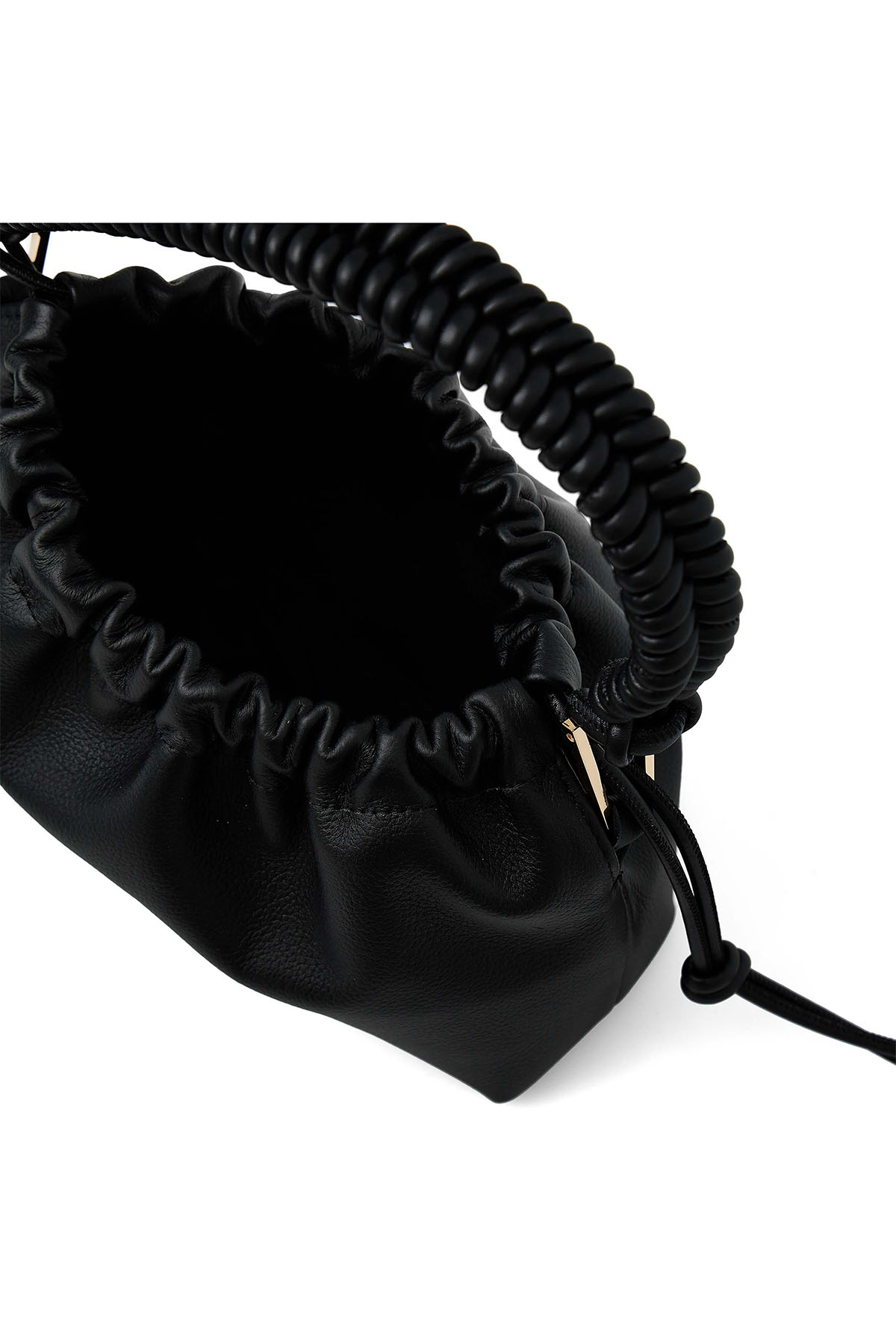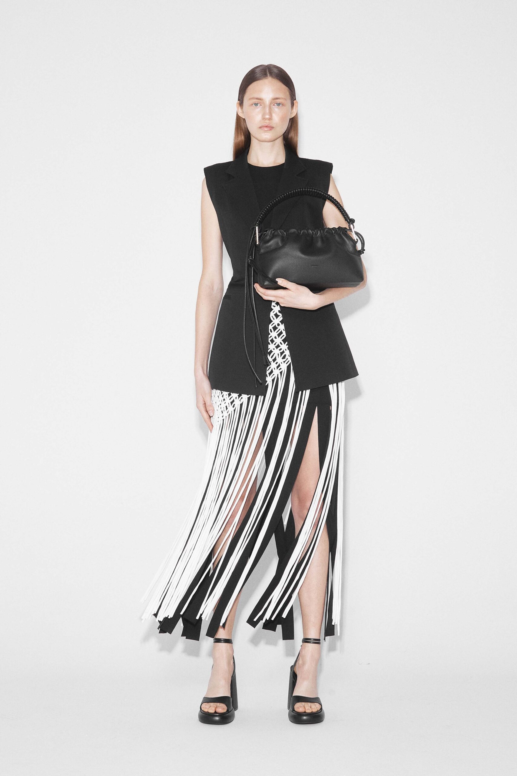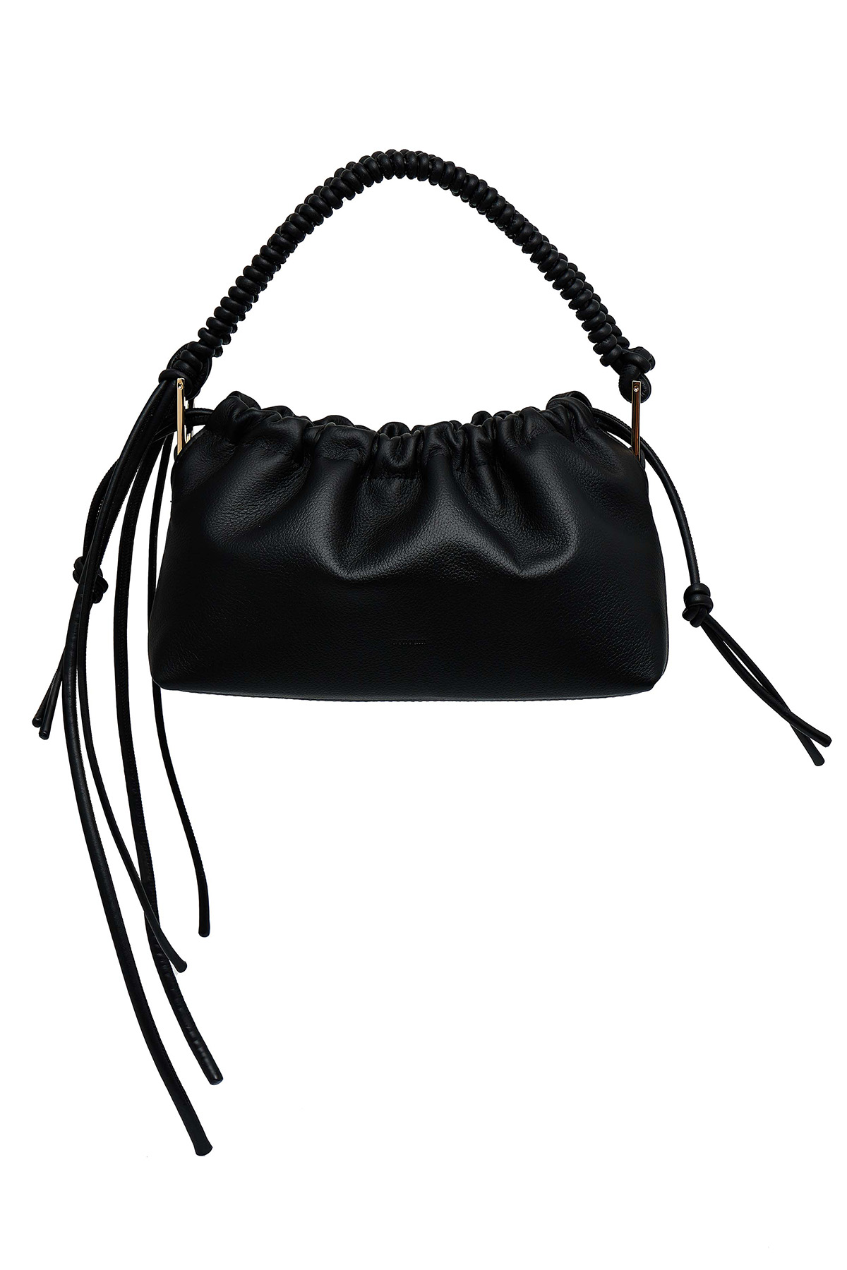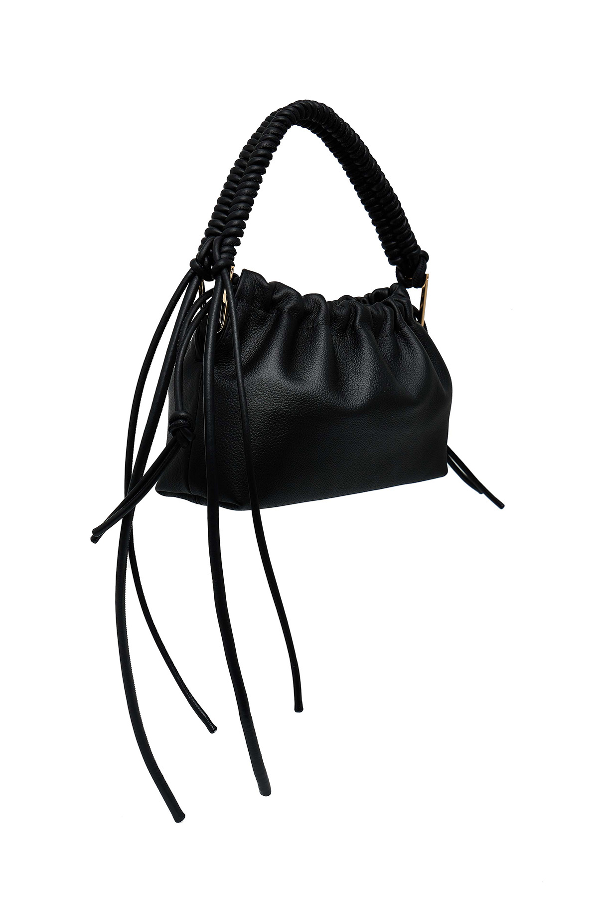 Soft medium black sack with tangle strap and extra leather tassels. Small pocket inside. Fastened with a leather rope. Embossed acnoum name outside. Dusty bag attached. Handmade in Poland.